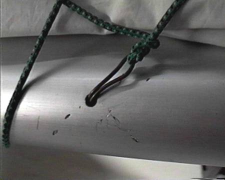 The close up shows my 'attachment' methods. No fancy boom bail here- just some plain vanilla copper wire (stripped 12 ga romex) that I formed in a big loop and snaked into the holes, with the 'knot' inside the boom. Then I formed them into loops that I tie the 3/16 shock cord to. These copper things swivel a little, and when the lazy jax are down, the 'swivels' point to whichever side is tighter, and everything sits about flush with the boom. Call me lucky, call me a crackpot, it makes no difference. My wife thinks I'm a %#@!$&% Genius.