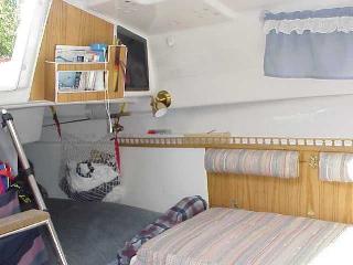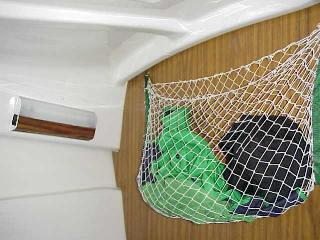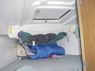 This shows a 12 V flourescent light mounted on the starboard side of the v berth and a hammock mounted on the head bulkhead.