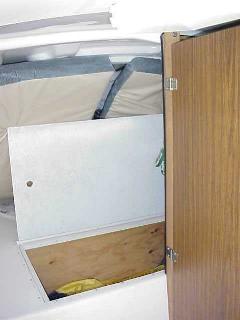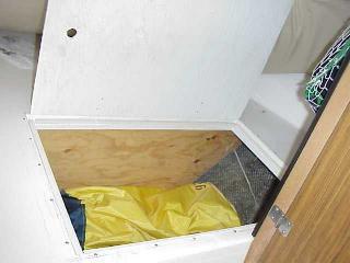 I enlarged the access hole and reinforced it with 1 1/2 X 1 1/2 inch wood cut out to allow the hatch to lay flush with the v berth "deck". I also supported the "deck" with 1/2 inch plywood bulkhead foreward of the new access hole. The floatation removed from other parts of the boat is in a plastic bag foreward of this bulkhead.