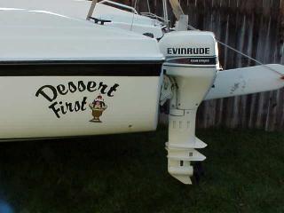 A picture of the boats name, made by a local sign maker. Also the electric start outboard that my wife loves.