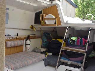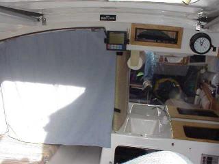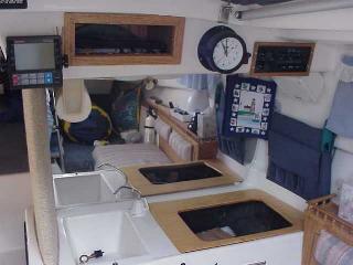 Modifications to the galley area include removing the propane stove the previous owner installed and covering the hole with a finished plywood top with a hole custom fit to an ice chest for day sailing. There is a silverware bag hanging on 2 inch diameter suction cups, curtains, radio/cassette deck, storage compartment next to the chronometer (a Christmas Present last year from my First Mate!).