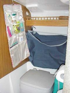 A view of the head showing blue laundry bag, pinrail shelf for TP, chemicals, toilet kits, etc. Also a hanging "medicine cabinet".