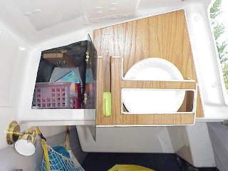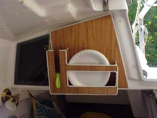 View of interior port and starboard sides Plate Storage Sheet Block access The previous owner put swivel sheet blocks/cleats on the combing top and opened up an access/storage area under the combing. Also note the neat plate rack. This idea was stolen from Windbarry, I think.