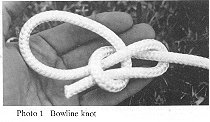 It is essential to learn to tie a bowline knot. It is used all over the boat to tie stuff together. It is shown in Photo 1. Pull the loops tight. It will not jiggle loose, and can be easily undone even after being pulled tight under really heavy loads.