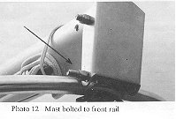 The mast is carried on the boat with the bottom end forward and the slotted side down. Bolt the mast step to the forward rail with a 1/4" x 4 1/2" bolt and lock nut, as shown in Photo 12. Make sure the nut is tight. Use locknuts on all hardware holding the mast to the boat.