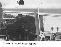 The wood mast support slips into the brackets at the rear of the cockpit. A thumb screw in the bracket is tightened into the wood to keep the wood from jumping out. Tie the mast securely into the V notch in the top of the wood support.(Photo 13).