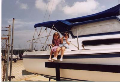 #7 side of bimini. the flap has 2 zippers (completely removable) so niether the bimini nor the pop top encl has to have a flap in place if i am just using the bimini or just the pop top encl by itself. Becky and Rachel enjoying the sunshine. daughter #3 just a twinkle at this point.