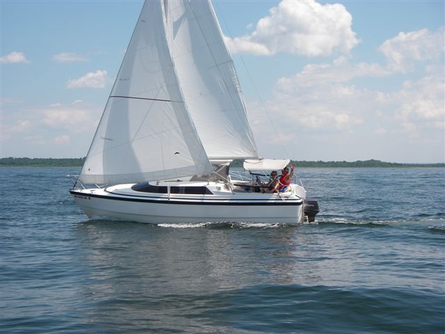 So Sunday dawned beautiful, with a light wind. The wind died and we motored to the south end of Prudence Island. We had a little wind - enough for Ken to make this comment: A Corsair is supposed to be a fast boat, but in 3 knots or less wind, we're as slow or slower than a MacGregor, and my 8 hp motor is no match for the 50's you guys have.