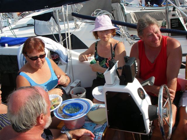 Rani had a different take on things: We anchored "Dror" for the first time , without a functioning depth gauge, and didn't drag our anchor! Thanks to Ed on "Dolphin" for playing depth gauge and overseeing our anchoring.(He really just wanted a big boat to raft up to.) We really enjoyed having all the visitors, and being able to host people. The boat never felt crowded
