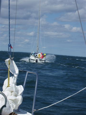 Sunday morning NOA radio told us that the trip to Nantucket would be called off. The wind and the waves would be too much and to sail there would be very rough and even worse on the way back on Tuesday. So it was sit tight and wait for noon so we could go through the hole. Again the sail to the hole was great and the wind was such that we motor sailed through. The other side was another story. We hit the wind head on so it was motor, Endurance and Puddle Hopper tried to sail but the wind and waves were too much.