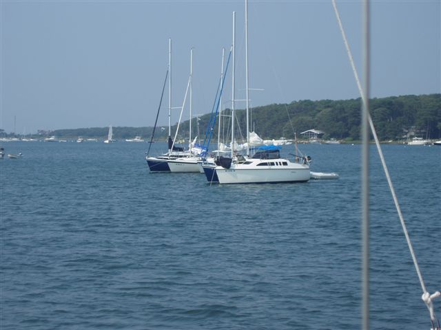 We continued to motor sail right into Lake Tashmoo on Martha's Vineyard. With very little wind and wave, this was a lot more relaxed. We started to look for a place to nest. Boats were all about, some on moorings, others trying to find a mooring or a raft to join up with. Barbara on the Buckaroo spotted us and hailed us over with an invitation to raft with them.