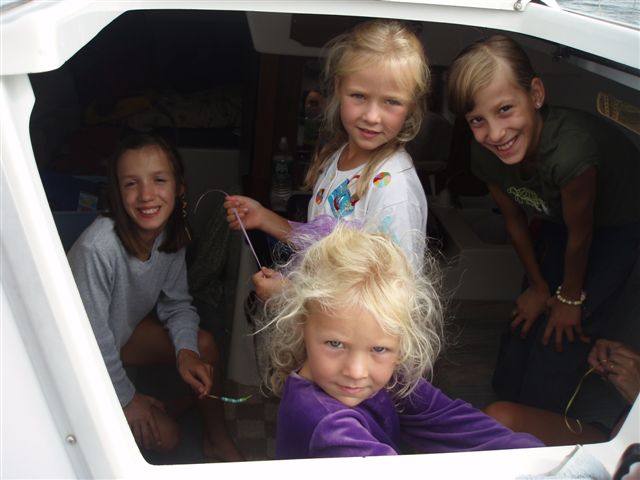 Julia and Galena re-introduced themselves to Mya and Taya of our companion boat. This little gaggle of girls (great description Nug!) had plenty to keep themselves entertained. From hair tying to DVD movies, this chirpy vortex of energy delighted in having the sailboats rafted up together. Our raft also got a visit from Jack, Rani and Cheni Chadowitz and lots of others.