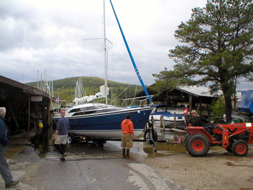 I arrived at Fays Marina at about 5pm. We were scheduled to go out to dinner at 6. Problem 1 - the water level was so high that we launched the boat with a tractor. That way we didn't send the car for a swim. I docked the boat, put up the mast and pop top cover and was ready to head out to dinner with the group. I haven't lost my touch of rigging quickly. Our group of 11 boats was dwindling fast but Al & Karen Hill, Chuck, Helen & Brianna Healey and George Lavoie & Ron Couture were there.