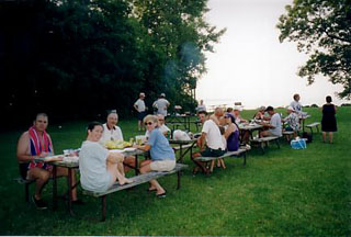 At Deep Bay Carol, Willy, Don Huff, Steve and Tabby Silvia, and I hiked through the woods taking several wrong turns on the way over to the swimming beach, it was crowded, hot, and muddy! We would have been better off swimming from the boat or shore in Deep Bay, which is what others did. In a south wind Burton Island is only a short sail on a reach from Deep Bay, and most arrived by 12:30 or 1:00, depending on drawbridge timing. It was another scorcher and swimming was again high on the list of preferred activities. That evening we got together for a potluck picnic and later music and singing. Pam and Bruce (Charis) caught up after flight delays caused a late start for them.