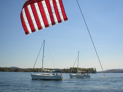 The first NETS/Moane rendezvous of the year was held at Fay's Marina. After quite a bit of rain, Friday cleared up, though it was still unseasonably cold. I was last to arrive at about 4pm. Chuck Healy, a new member, "volunteered" to make arrangements for us at Fay's and was on hand to greet us. George Lavoie and his friend Ron came down from Canton Maine. Ken Fordham and his wife Marilyn and friend Josiah, who keep their new-to-them Catleina 25 at Fays, were there getting their boat ready for the summer. Chuck and his wife Helen and their younger daughter, Brianna brought their boat up from Ames Farm for the weekend. And lastly Ed Goodhue brought his boat up from the Cape and offered me his "guest cabin" for the weekend. After rigging we went out for dinner at the Sawyers and then George and Ron, Ed and I hunkered in for a verry cold night. Saturday dawned chilly, with light winds.