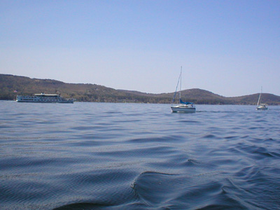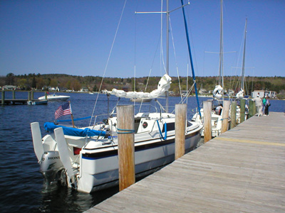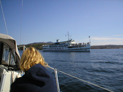 Saturday night wasn't quite as cold but there was frost on the cushions on Sunday morning. Don Huff and Ed's son Ted joined us for the "sail" on Sunday - this time to Wolfboro for ice cream. The day was warmer and again no wind. There were more boats on the lake so we couldn't get near the docks for our ice cream. We had some wind on the way back and thoroughly enjoyed the warm sun and clear skys.
