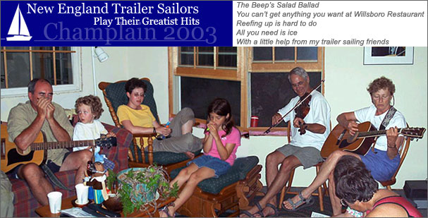 On the last day of Lake Champlain Rendezvous 2003, a party was held at the home of Ms Chevious. We'd completed a week on Lake Champlain, sailing together across seven (and in some cases, more) ports. As is tradition, those with musical talent brought their instruments. The New England Trailer Sailor Band did not disappoint! |