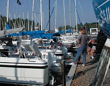 Soon Barbara Garland pulled up. She pitched in to rig Lady-in-Red. A few moments later George Lavoie and his friend Ron showed up with his 26x Nauti 'N Nice — striped with a sharp looking blue line just under the black strip under the rub rail. Really really sharp.