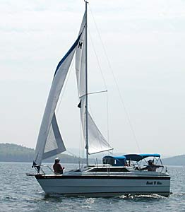 Above: George Lavoie and friend Ron come about in Nauti 'N Nice.